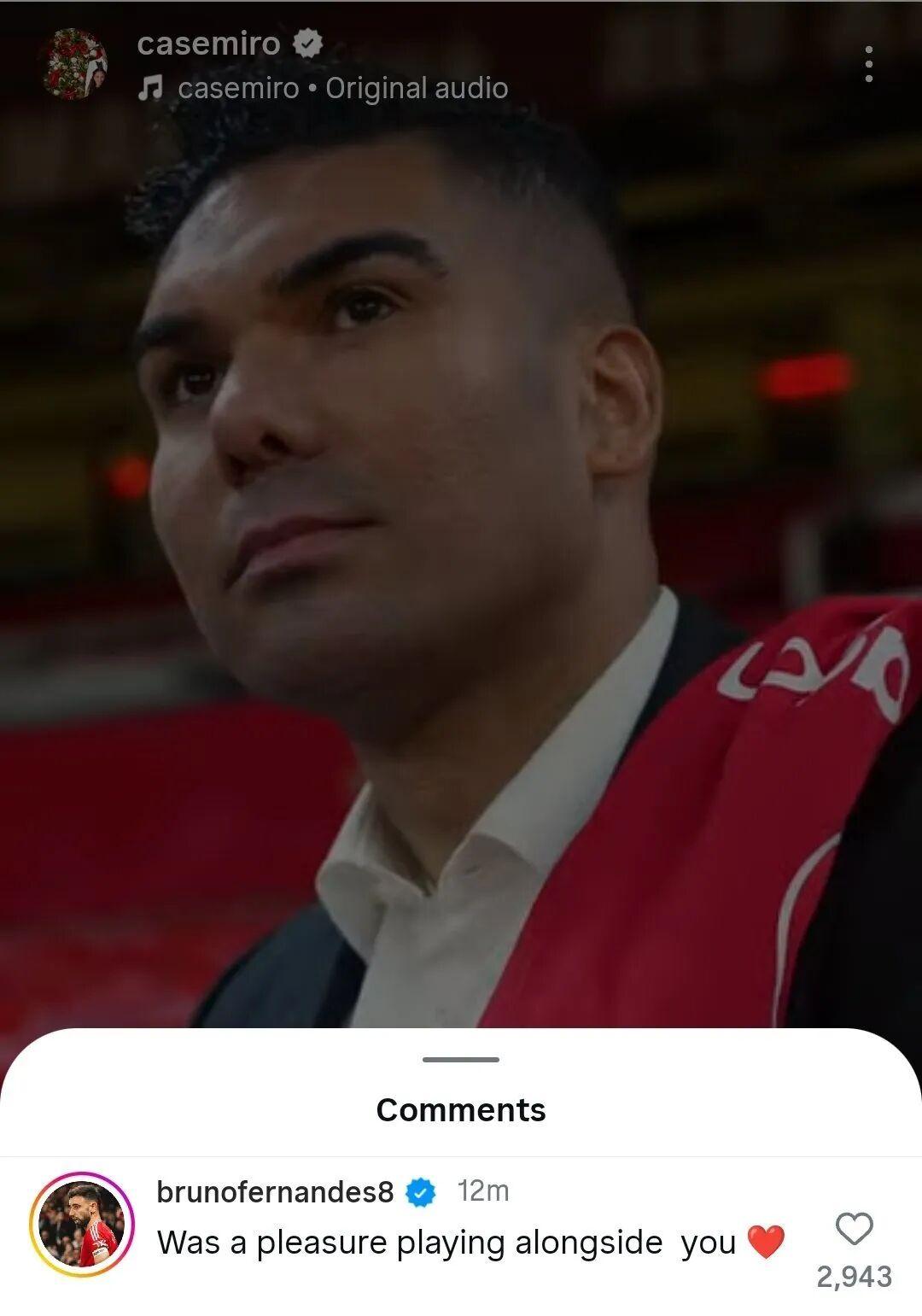 和你共事太愉快了,Case!我从你身上学到了太多:领导力、团队精神、谦逊、拼搏、个性、尊重,最重要的是——如何享受足球(球不会烫脚)。我爱你,@ casemiro。